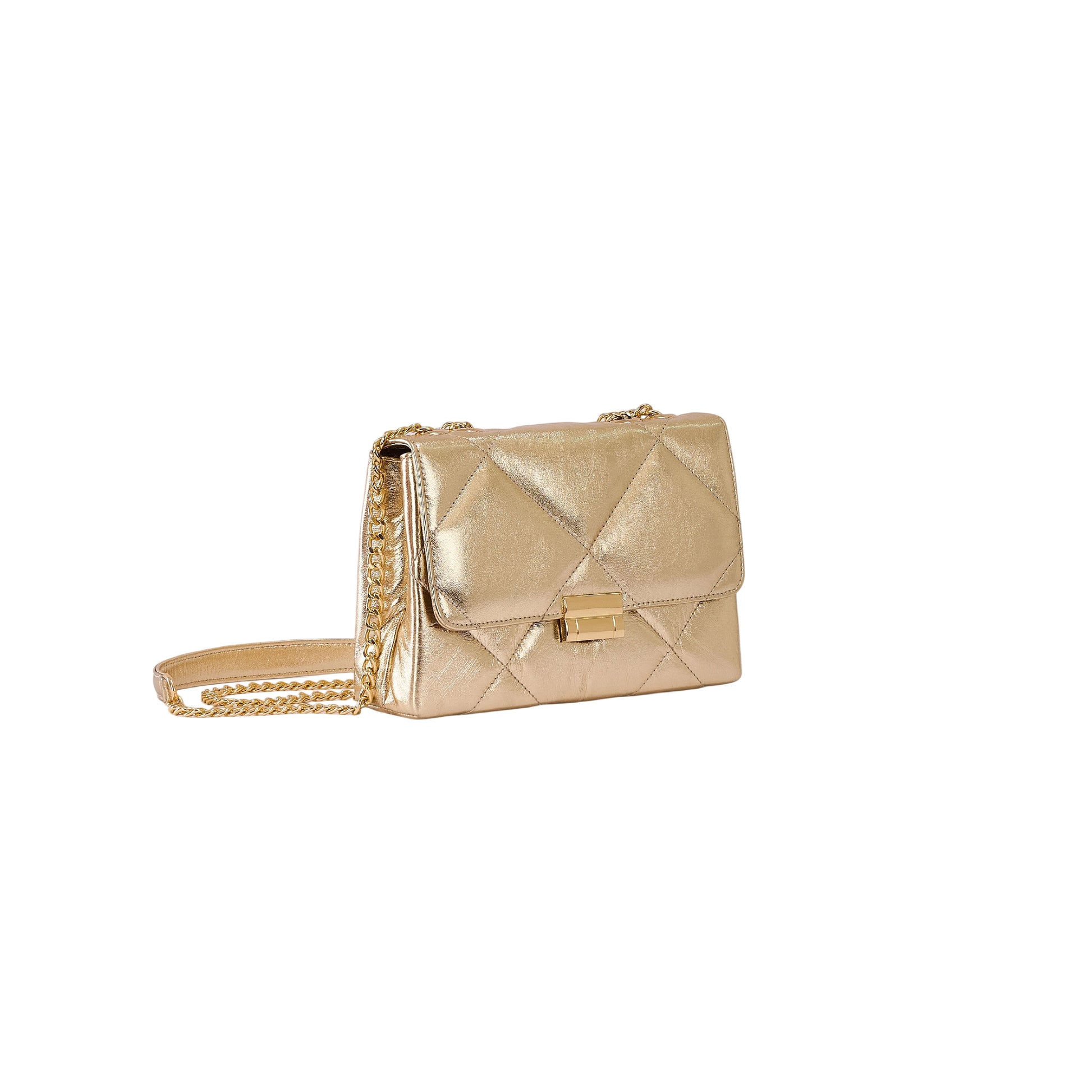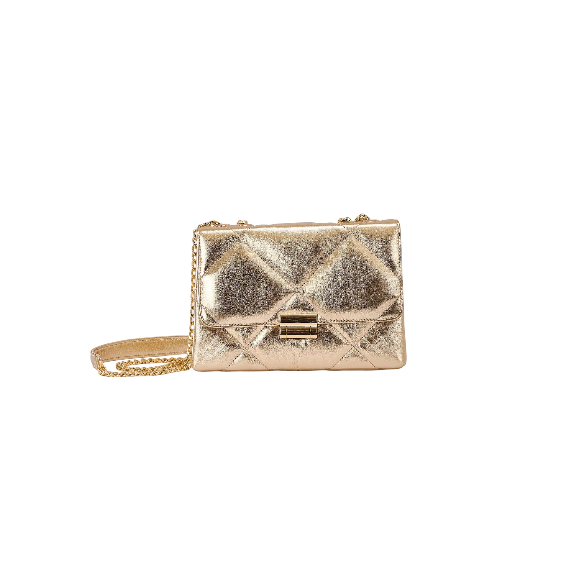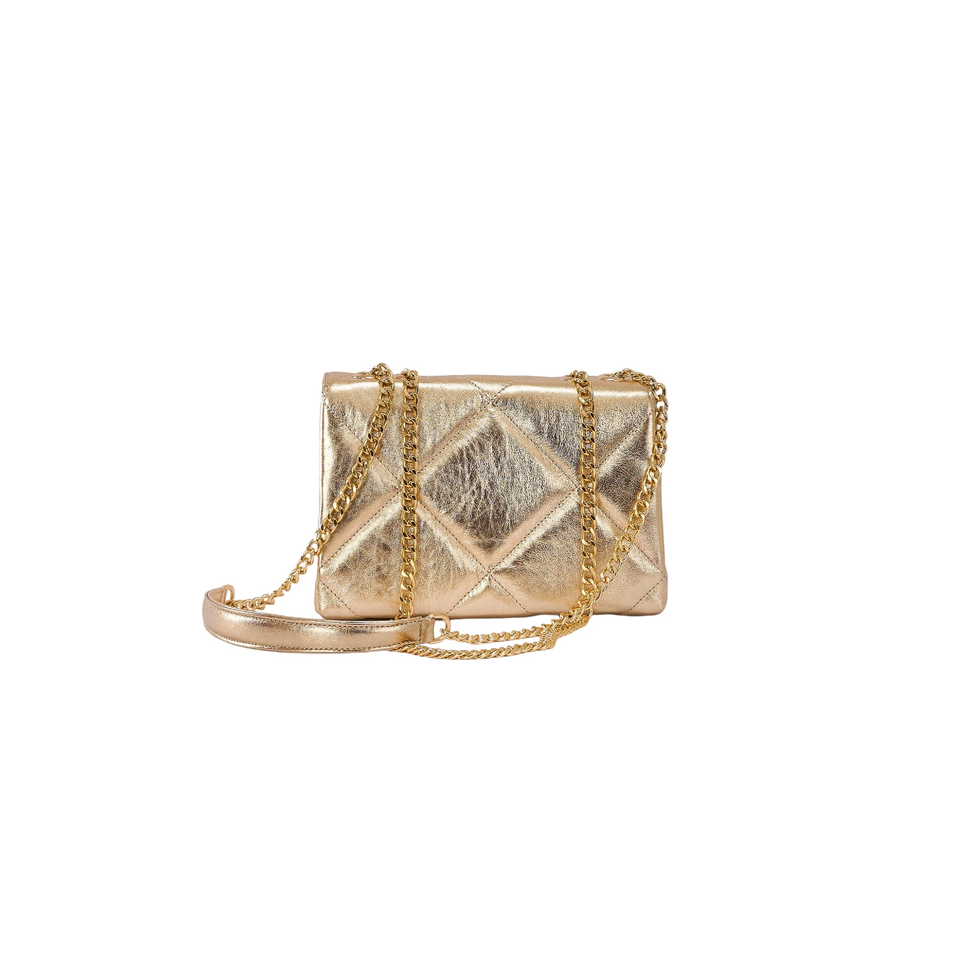 - Quilted genuine leather with a metallic gold finish